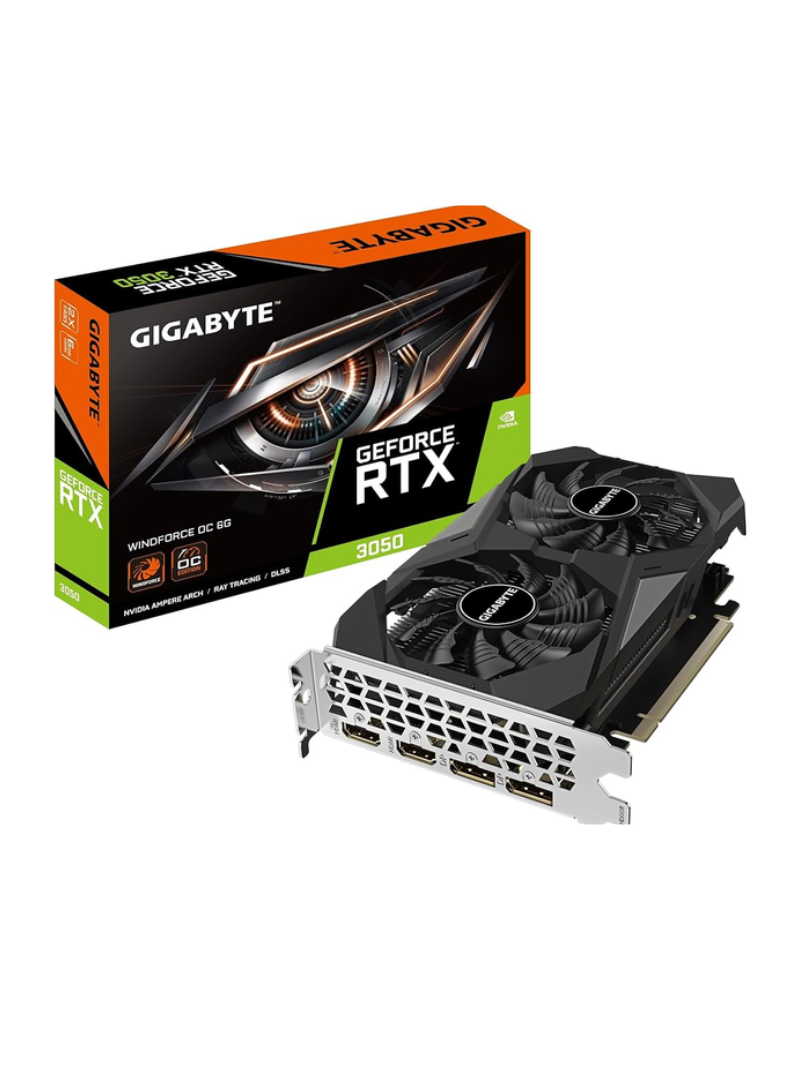 Видеокарта GIGABYTE GeForce RTX 3050 WINDFORCE OC 6G 6ГБ GDDR6, архитектура Ampere, 1780 МГц (Boost), 1x HDMI, 3x DisplayPort, поддержка Ray Tracing, PCIe 4.0.